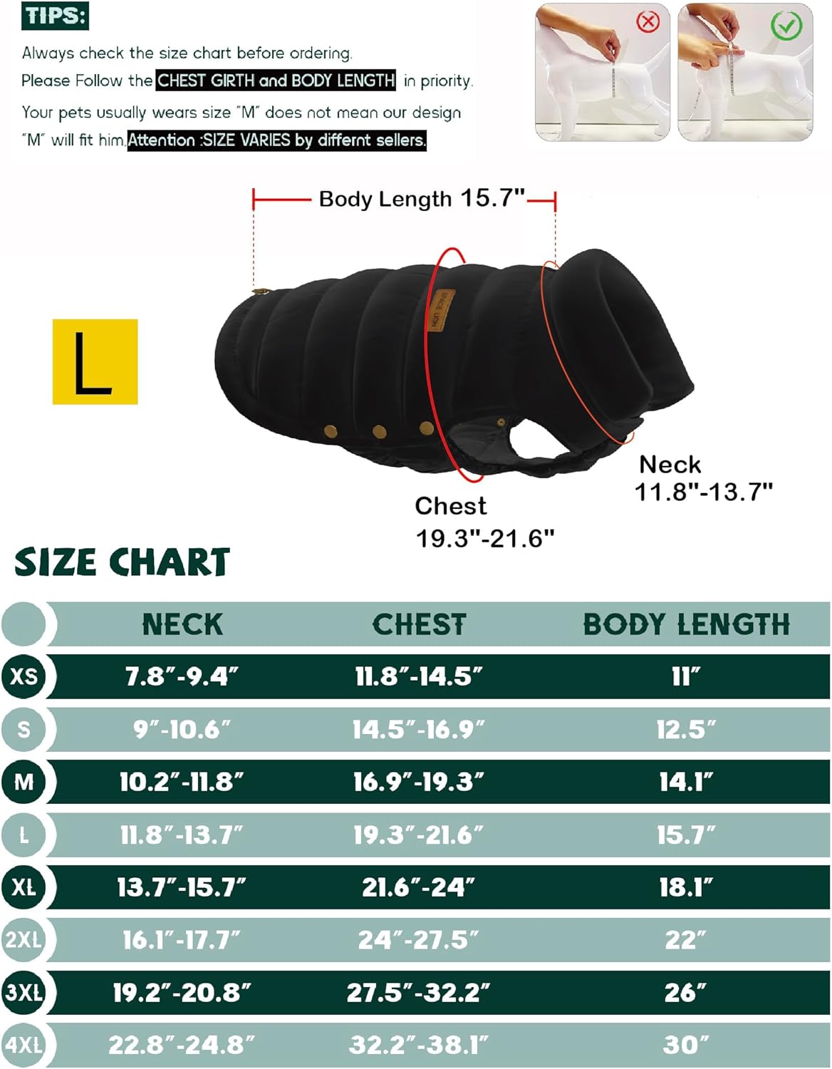 Neck: 11.8″–13.7″, Chest: 19.3″–21.6″, Length: 15.7″.